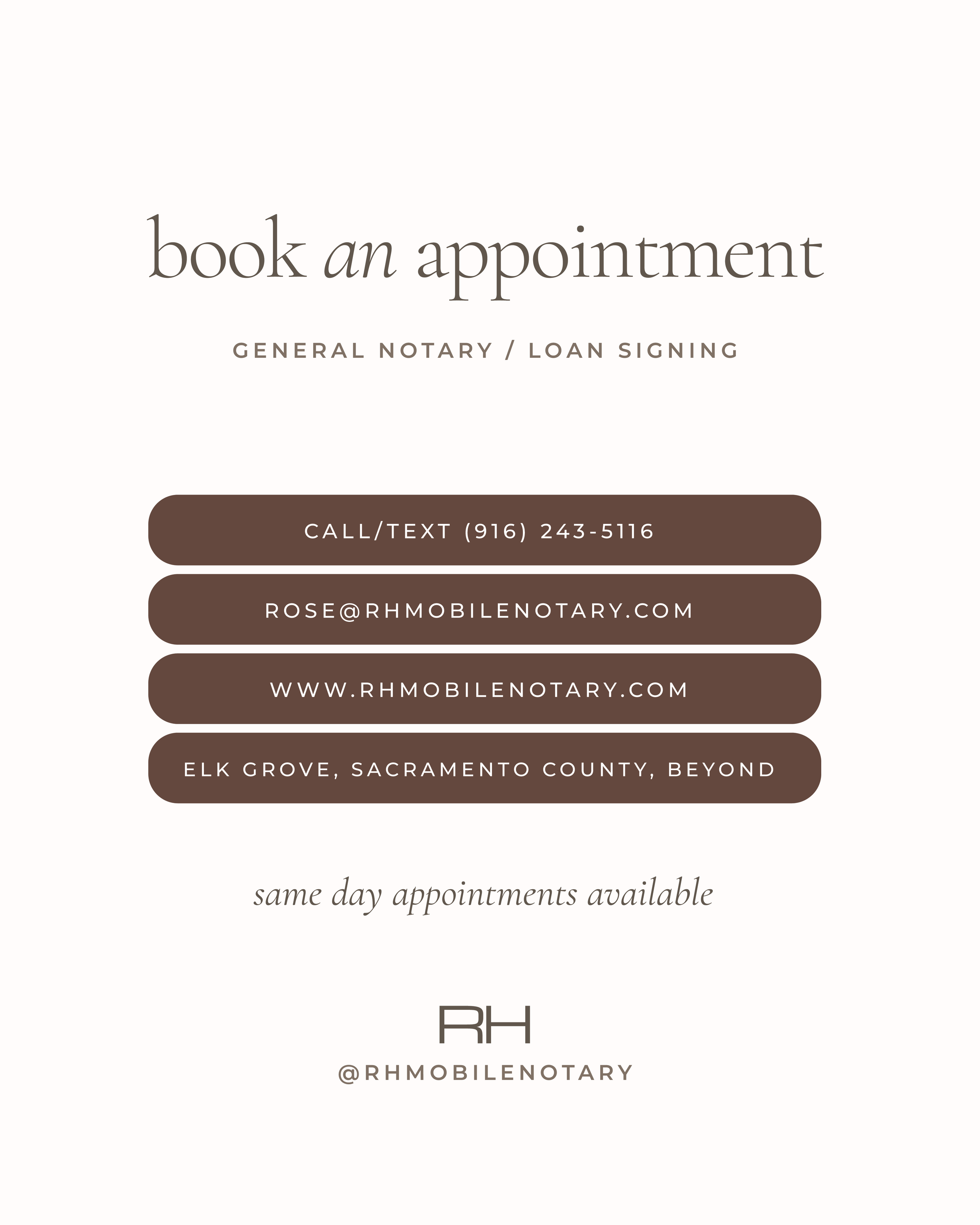 Hi, I’m Rose Hermosillo, the face behind RH Mobile Notary. Based in Elk Grove, I provide reliable, convenient, and stress-free mobile notary services throughout Sacramento County and beyond. I know your time is valuable, so I offer flexible scheduling— evenings, weekends, and even last-minute appointments. Whether we meet at a coffee shop, your office, or your doorstep, you can count on me for a seamless, professional experience when it comes to all your notarial needs.